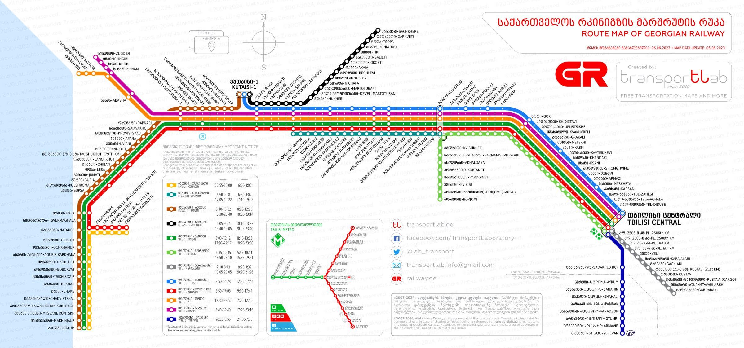 Georgia también tiene una pequeña red de trenes que conecta el país de forma transversal, así como algunas rutas internacionales hacia Yereván (Armenia) y Bakú (Azerbaiyán). Básicamente, la red ferroviaria georgiana conecta Tiflis con la costa del Mar Negro y Batumi en una única línea de la que parten algunas ramificaciones.